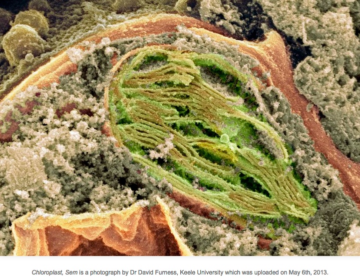 Consider this leaf …A thousand years ago we looked and could see only so far in terms of seeing what is really there. All you can see is green. It is a green sheet. It’s just a leaf. You can see no structure here apart from veins and the texture. But it’s not – as you might think – some sort of green fabric, with the dye uniformly distributed. With the development of good light microscopes we were able to see that the green was confined to little bean-shaped dots, the chloroplasts, which is where the sugars are made. Because they are so small, that’s all your can see with a light microscope. The average chloroplast is about 3 micrometres across (a micrometre is a thousandth of a millimetre). In one square millimetre of the surface of a leaf, there are about half a million chloroplasts.